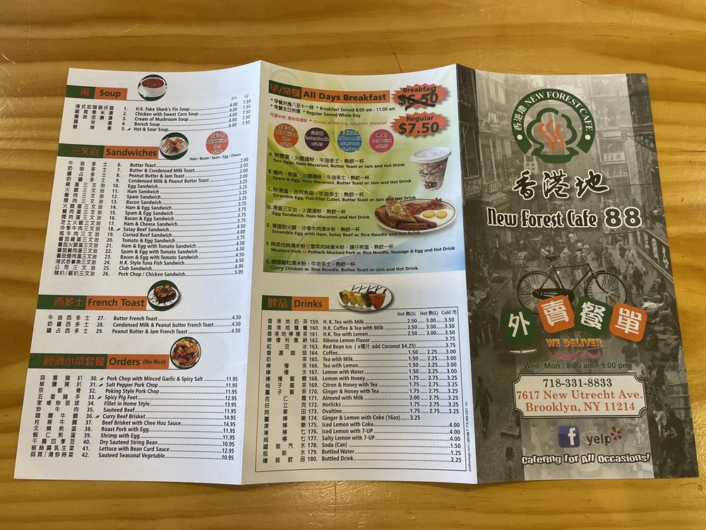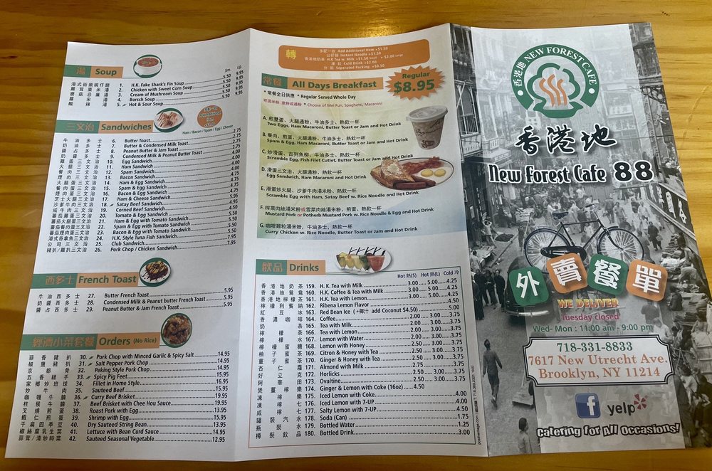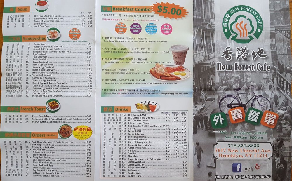 Introducing the menu at New Forest Cafe in Bensonhurst, NYC, where traditional Hong Kong dishes are served with authenticity. The Munchies Menu offers a variety of appetizers like Baked Mussels with Cheese, Buffalo Wings, and Fried Dumplings. For soups, options include Borsch Soup and Hot and Sour Soup. The Noodle Soup and Lo Mein selection features classic dishes like Curry Fish Balls Noodle Soup and H K Style Beef Brisket Lo Mein. Customers rave about the nostalgic flavors, with favorites like the Curry Fishballs and the Minced Pork Noodle Soup with Veggies and Egg. The cozy atmosphere and old-school service add to the charm of this hidden gem. A must-visit spot for a taste of Hong Kong cuisine in NYC.